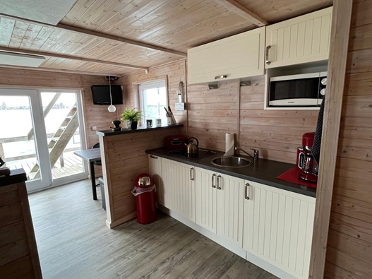 Hausboot mit modern ausgestattetem Wohnzimmer, offener Einbauküche, großem Schlafzimmer, separatem Duschbad/WC und riesiger Dachterrasse.
